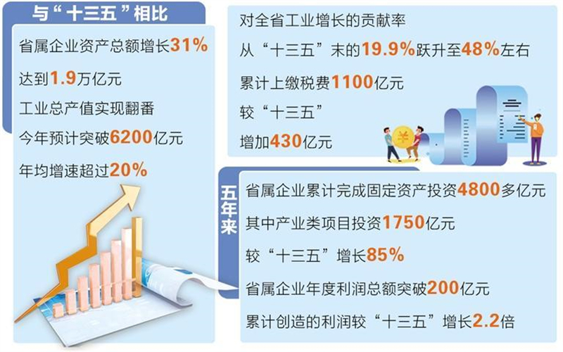 布局結構持續優化。省屬企業累計完成研發經費投入470億元,較“十三五”增長2倍,工業企業研發投入強度從“十三五”末的1.6%增長到3%左右;新產業、新業態、新商業模式“三新”業務收入年均增速超20%,攻克8項“卡脖子”技術和37項關鍵核心技術。累計完成傳統產業“三化”改造投資近700億元,打造一批國家級專精特新“小巨人”企業、國家級綠色工廠和省級制造業單項冠軍企業、數字化車間;謀劃實施國有資本布局優化和結構調整“6+1”行動,累計完成投資660億元,省屬企業戰略性新興產業年產值突破1000億元。